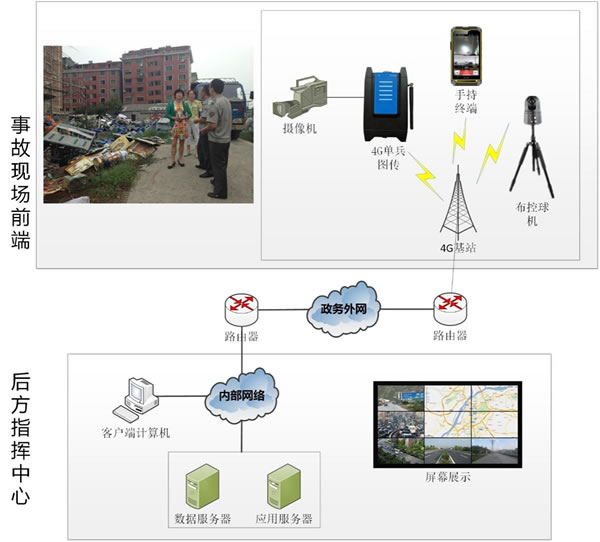 3、 小型移動(dòng)應(yīng)急平臺(tái)系統(tǒng)。由單兵圖傳系統(tǒng)、手機(jī)終端構(gòu)成,實(shí)現(xiàn)事故現(xiàn)場(chǎng)信息采集,并實(shí)時(shí)回傳指揮中心。