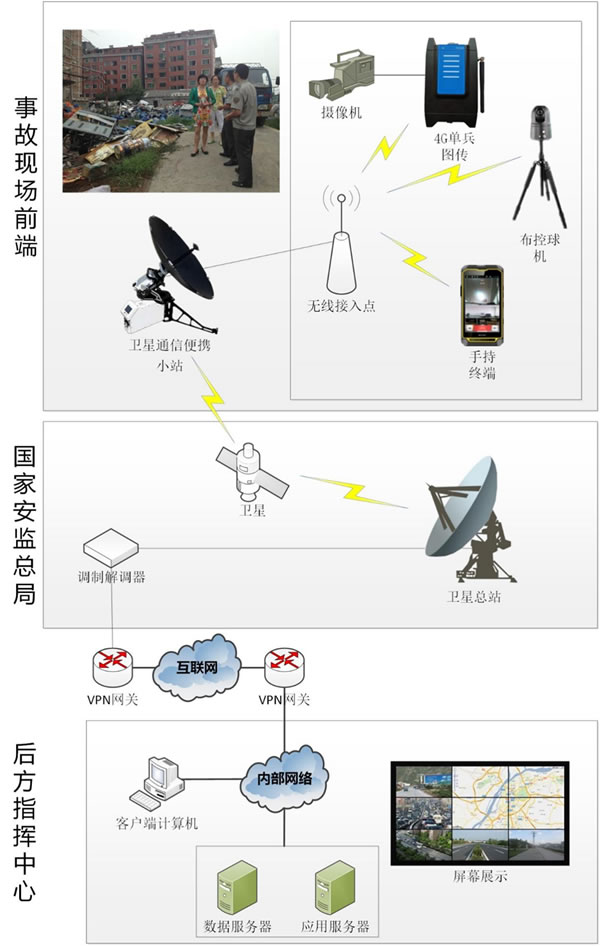 衛(wèi)星系統(tǒng)現(xiàn)場(chǎng)端采用衛(wèi)星通信便攜設(shè)備,可通過(guò)國(guó)家安監(jiān)總局建設(shè)的亞洲7號(hào)通信衛(wèi)星系統(tǒng)實(shí)現(xiàn)衛(wèi)星網(wǎng)絡(luò)落地,再通過(guò)互聯(lián)網(wǎng)VPN鏈路(京津安全生產(chǎn)應(yīng)急聯(lián)動(dòng)協(xié)同平臺(tái)試點(diǎn)建設(shè)項(xiàng)目完成)實(shí)現(xiàn)總局端與廊坊市安監(jiān)局的網(wǎng)絡(luò)連接。